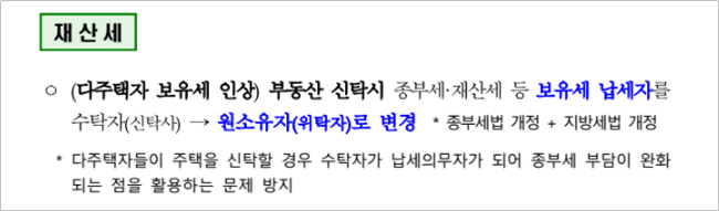 710 정책 중 재산세 관련 업데이트 된 부분은, 무주택자는 상관없고. 아파트를 아주 많이 가진 사람이 편법?으로 신탁자산으로 편입해서 세금 덜 내는 경우가 있었는데 그걸 잡겠다는 취지에서 규제가 생긴듯 하다.