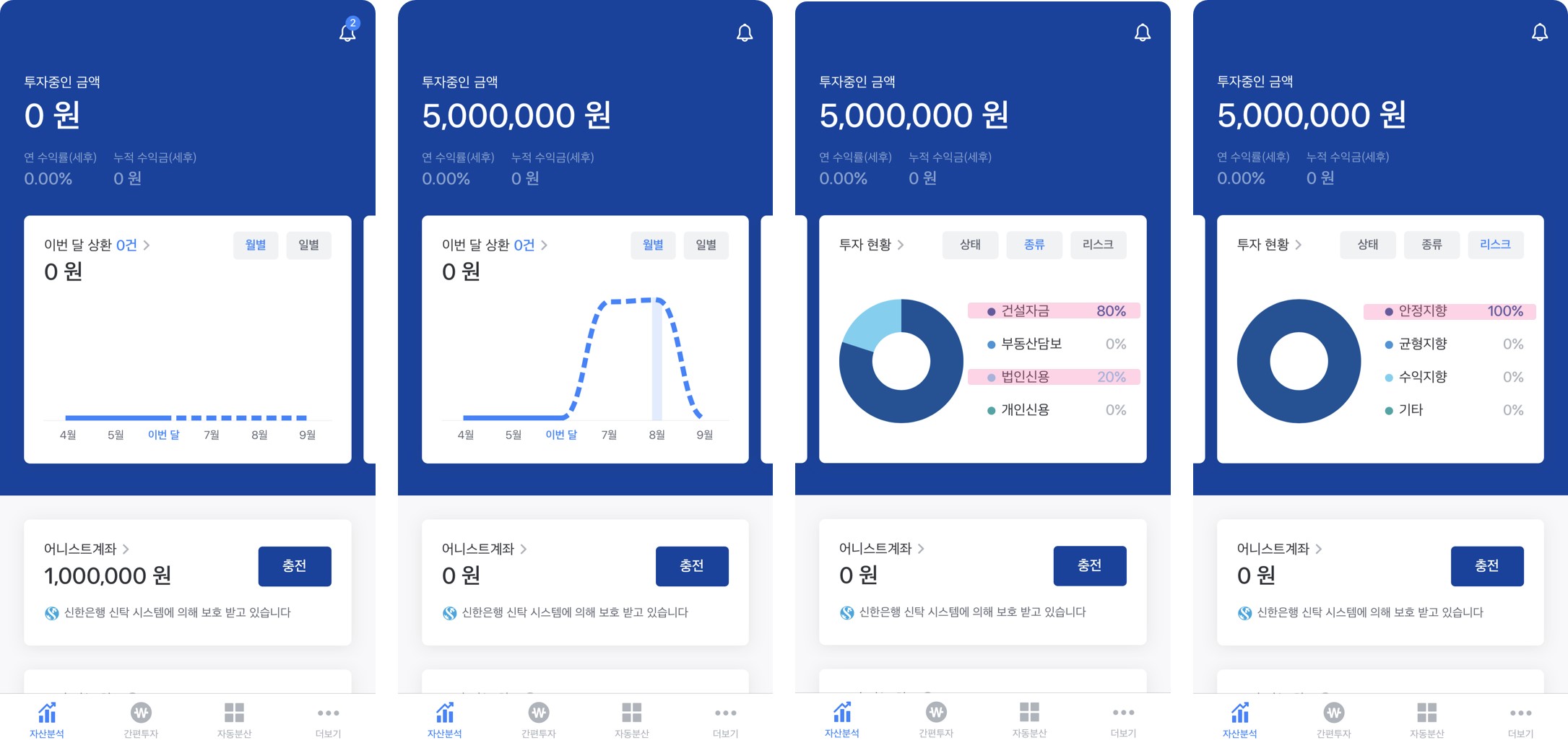 투자를 완료하면 앱 홈 화면인 자산분석 페이지가 좌측 두 번째 처럼 변한다. 라인과 바 차트로 내가 투자한 상품의 월별 수익률과 내가 선택한 상품의 종류 및 구성을 보여준다. 예를 들어 내가 투자한 SCF 상품의 경우 이번달 투자 시작에 2개월 후 상환 예정이라서 그래프 형태가 8월까지만 변동이 있고, 선차트는 이자 수익, 바차트는 상환될 원금을 보여주는 듯? 전반적으로 앱의 UI가 직관적이라 이용하기 편했다. 아무리 좋은 상품이라도 사실 앱이 불편하면 신뢰도 안가고 투자하고 싶지 않아지는 것이 사람인지라...그런면에서 어니스트펀드의 앱은 첫인상이 매우 호감이었다.