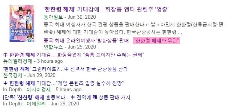 그리고 어제자 6월 30일에 중국 씨트립에서 온라인으로 한국 광관상품 판촉을 진행한다는 뉴스가 쏟아져 나오면서 주가가 거의 10% 전후로 뛰었다. 하이트진로 하락세 직전에 매도해서 난 수익을 들고 뭐할까 고민하다가 우연히 기사를 읽고 홀린듯이 매수결정을 하고 말았고...평소 돌다리도 부셔보고 건너는 내 성향에 없을 일이지만, 주요 지표 하나 제대로 검토하지 않은 채 들어가고 말았다. 하루 채 가기 전에 추가 보도가났는데, 관광공사에서 한한령 공식 해제가 아니라고 확인했다고 한다.